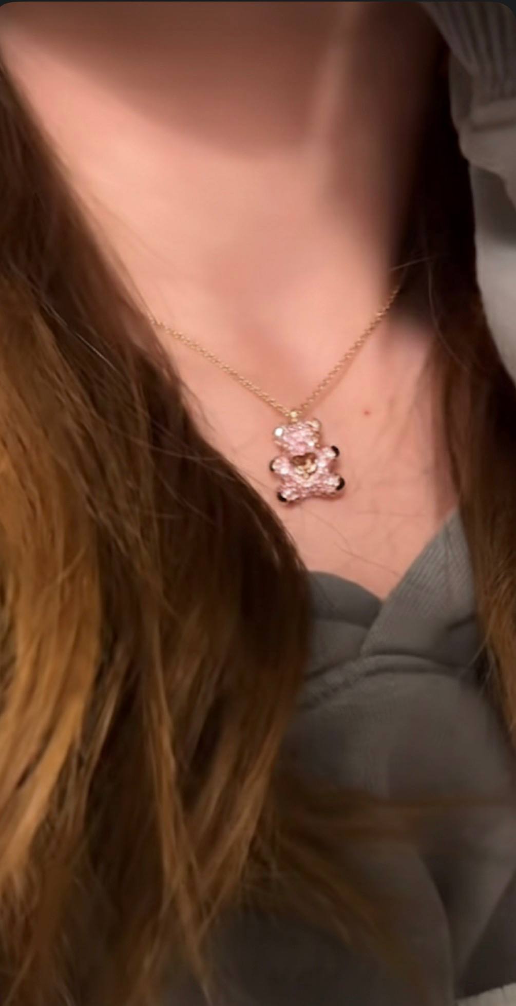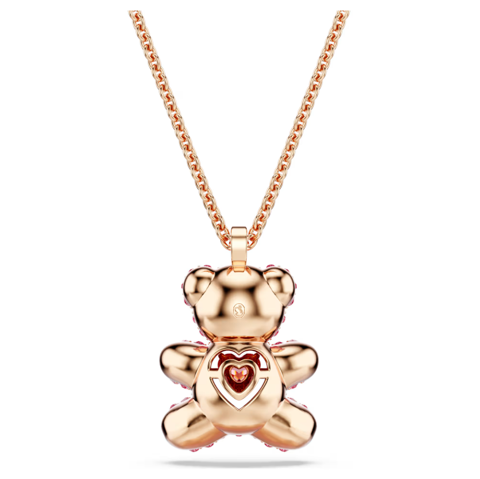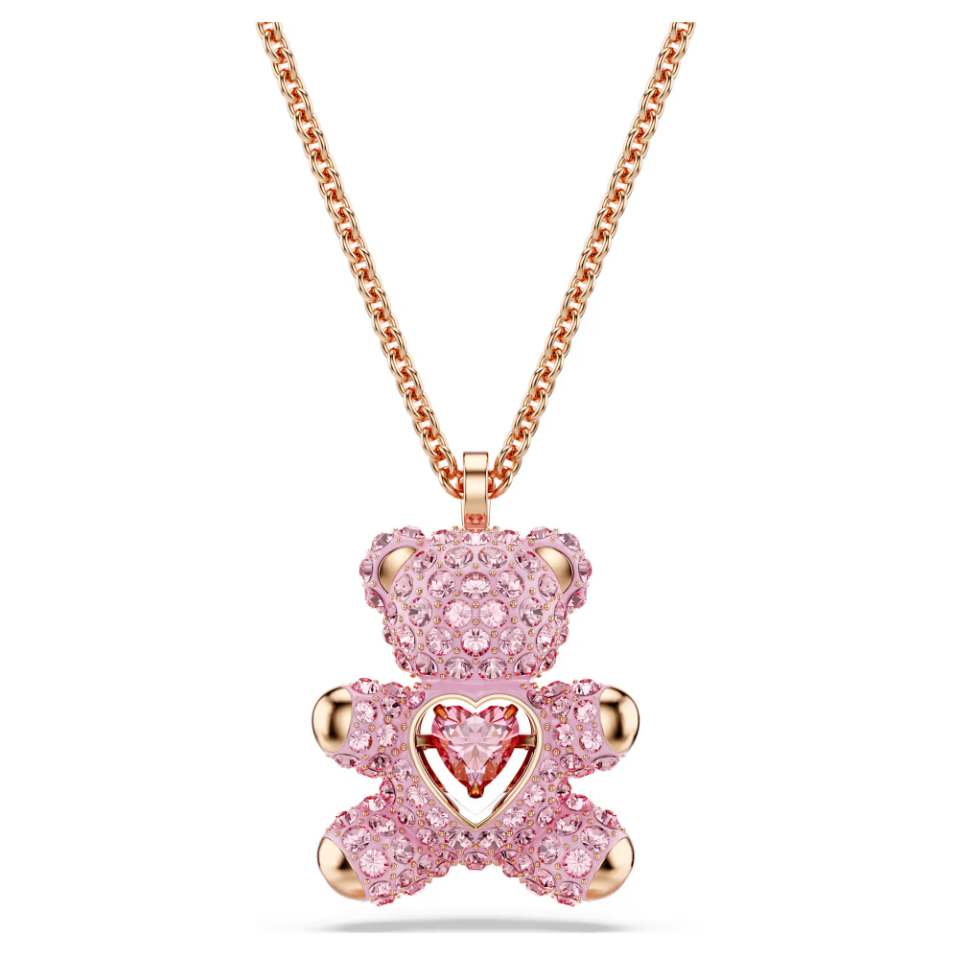 Realizzata in lega di zinco placcata oro rosa 18k con tripla placcatura anti-ossidazione. Oltre 40 micro-cristalli in zirconia cubica rosa incastonati a mano sul teddy bear. Cuore centrale in cristallo sintetico taglio brillante. Completamente nickel-free e ipoallergenica.